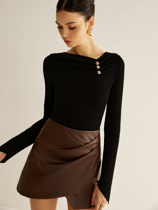 Metal Detaylı Suni Deri Cepli Mini Etek