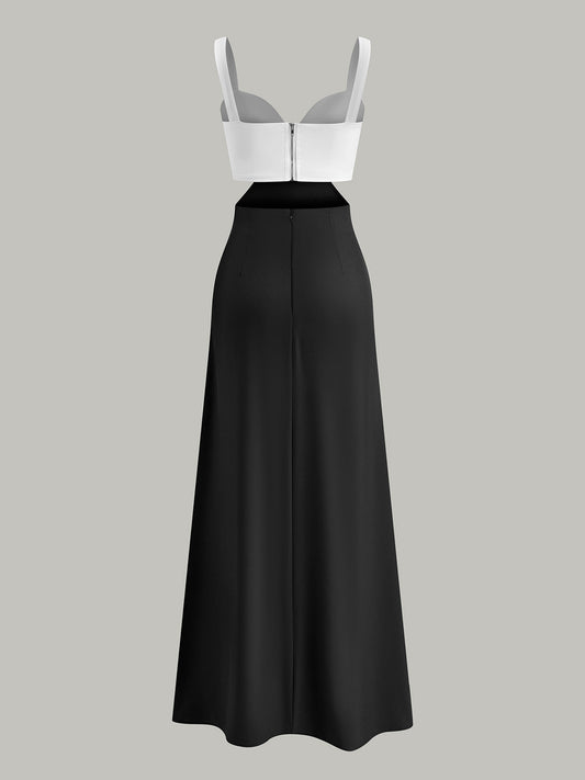 Renk Bloklu Spagetti Askılı Uzun Elbise