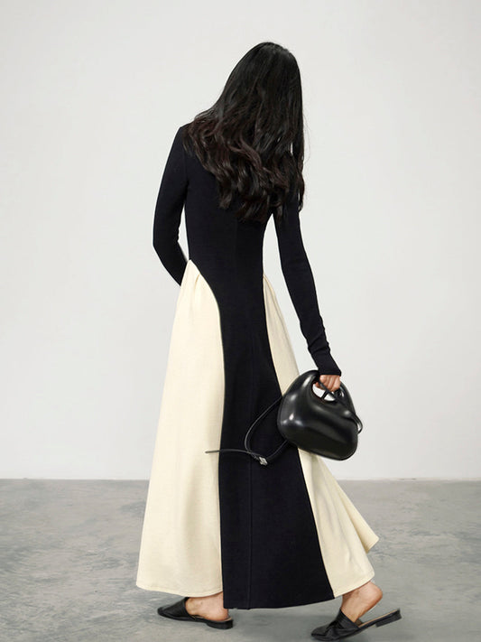 V Yaka İki Renkli Pileli Düğmeli Elbise