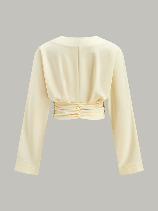 V Yaka Kıvrımlı Bel Dekor Düğmeli Kırpılmış Bluz