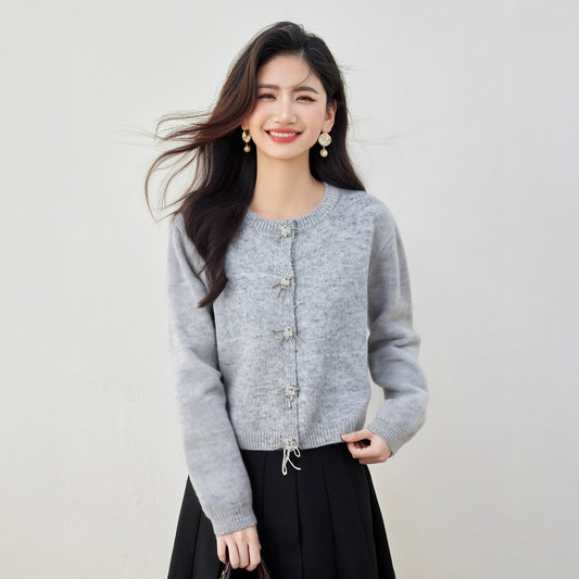 Yuvarlak Yaka Altın Düğmeli Örgü Dış Giyim