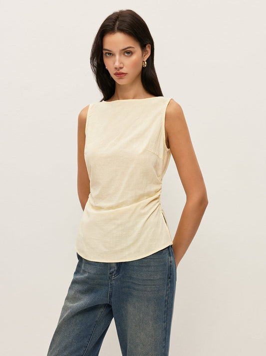 Pamuklu Düz Tekne Yaka Büzgülü Bel Kolsuz Bluz