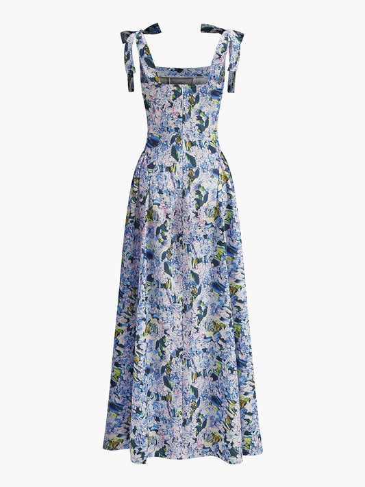 Kare Yaka Sırtı Açık Fiyonklu Çiçekli Elbise