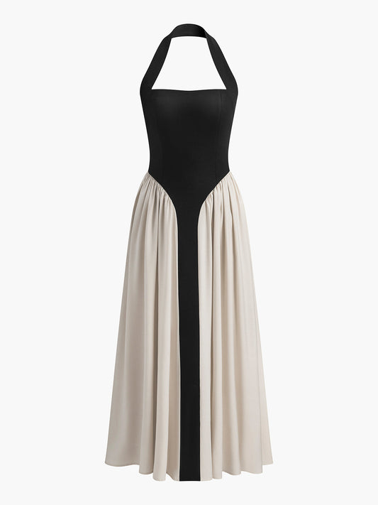 Renk Bloklu Halter Yaka Keten Karışımlı Elbise