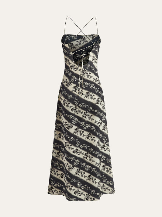 Çiçekli Çizgili Çapraz Sırtlı Uzun Elbise