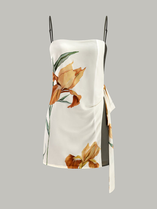 Çiçek Kontrastlı Kesim Düşük Kesim Askılı Mini Elbise