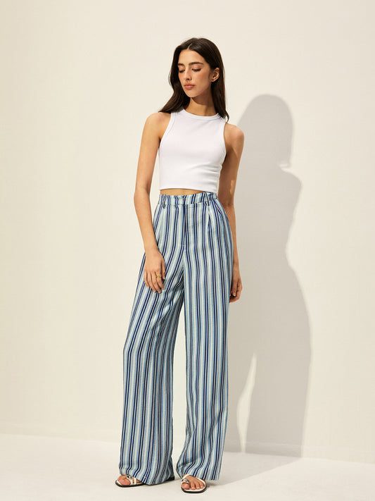 Pamuk Karışımlı Yüksek Bel Çizgili Pantolon