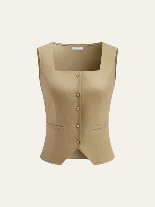 Düğmeli Ön Askılı Yaka Sırtı Açık Yelek Blazer Etek Takımı