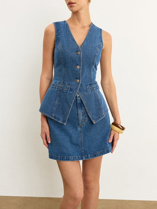 Kısa Kollu Düğmeli Kırpılmış Üst Etek Takımı