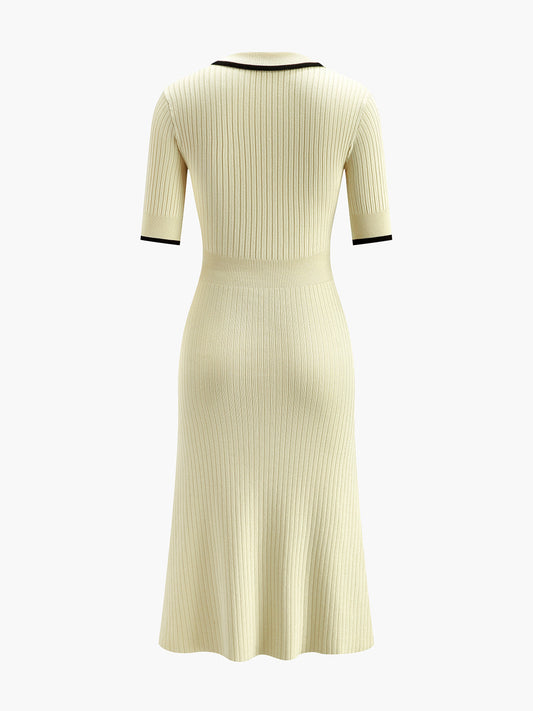 Kontrast Trim Yakalı Kaburga Örgü Kısa Kollu Midi Elbise