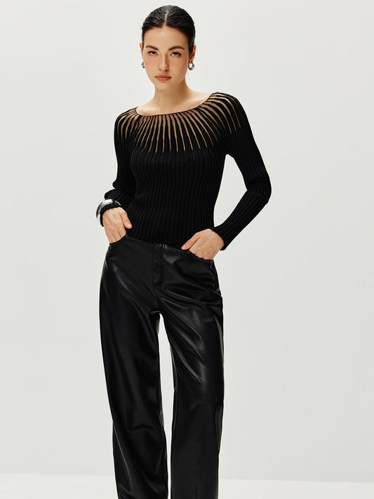 Yün Karışımlı Yarı Şeffaf Yivli Örgü Üst