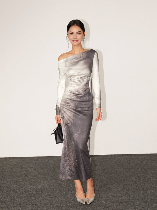 Asimetrik Soğuk Omuz Baskılı Elbise
