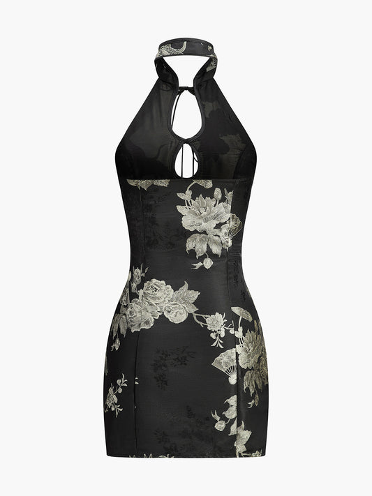 Çiçekli Açık Sırt Baskılı Kısa Elbise