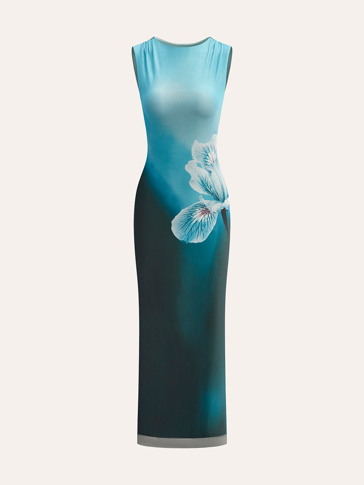 Sırtı Açık Çiçek Desenli Kolsuz Elbise