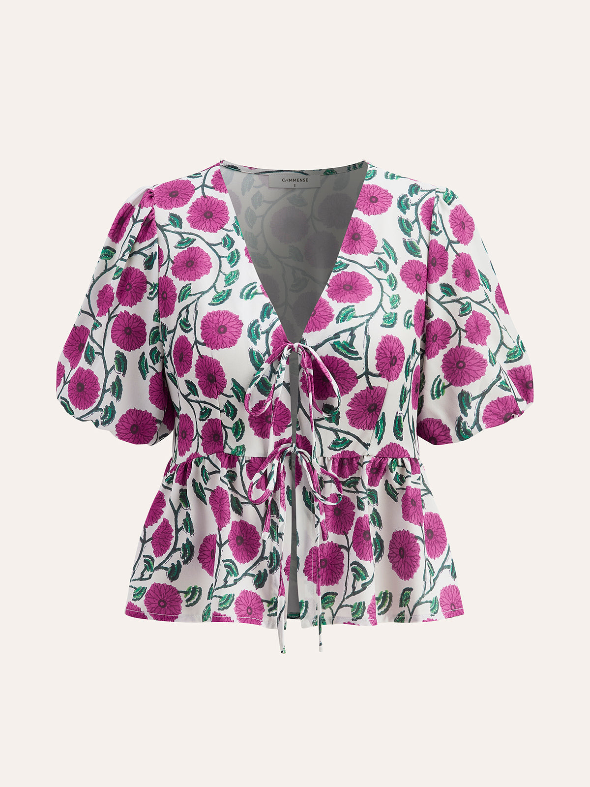 Boho V Yaka Bağcıklı Puf Kollu Etek Takımı