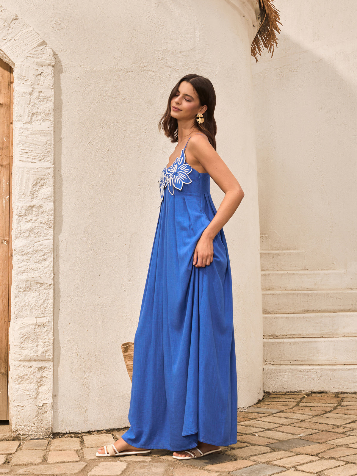 Pamuk Ve Keten Çiçek Detaylı Cepli Askılı Elbise