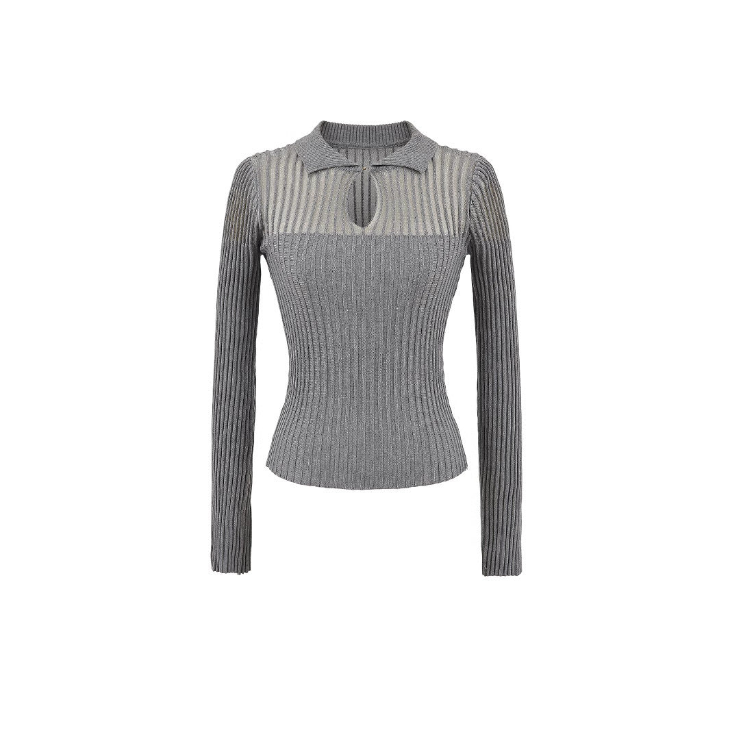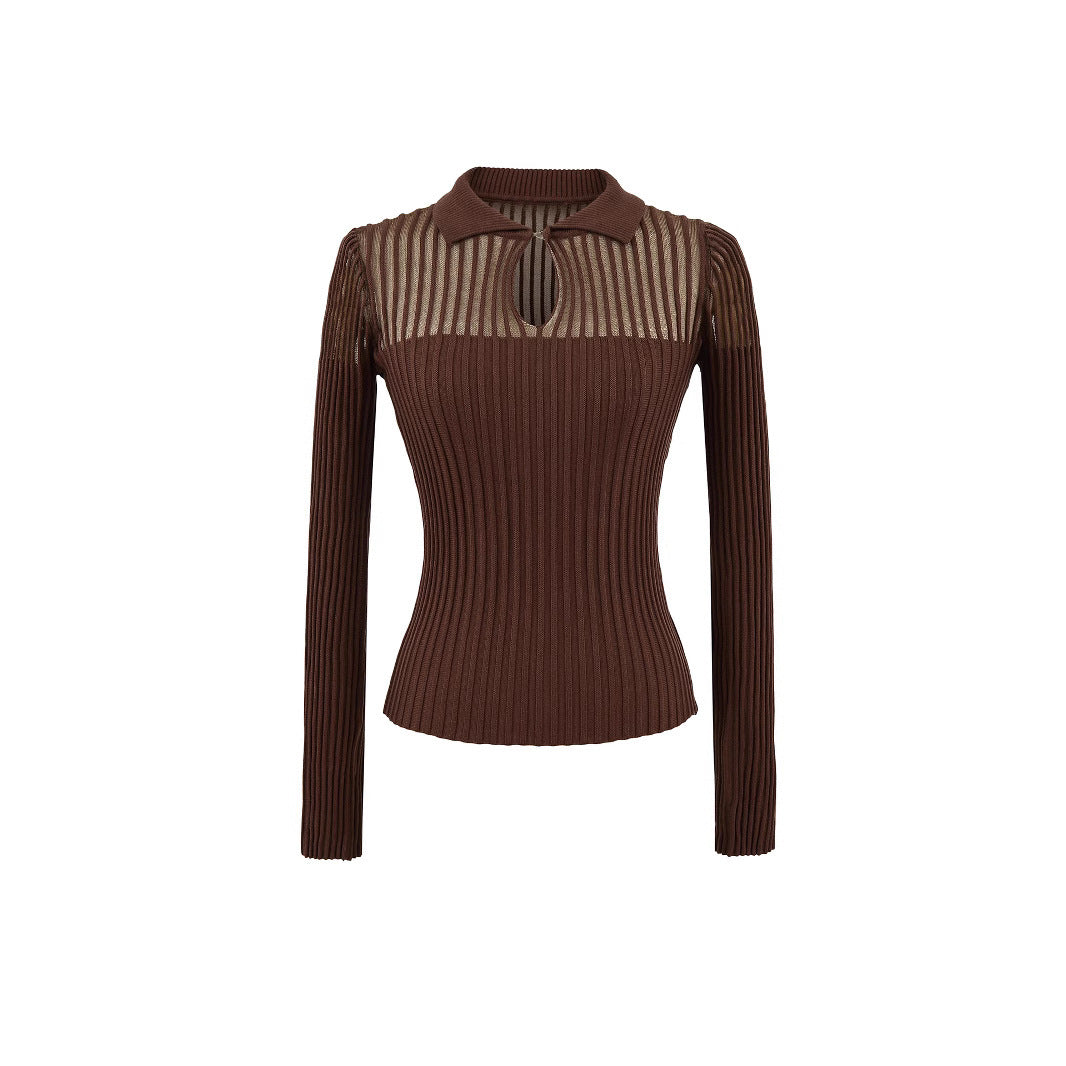 Anahtar Deliği Yaka Yarı Şeffaf Örgü Üst