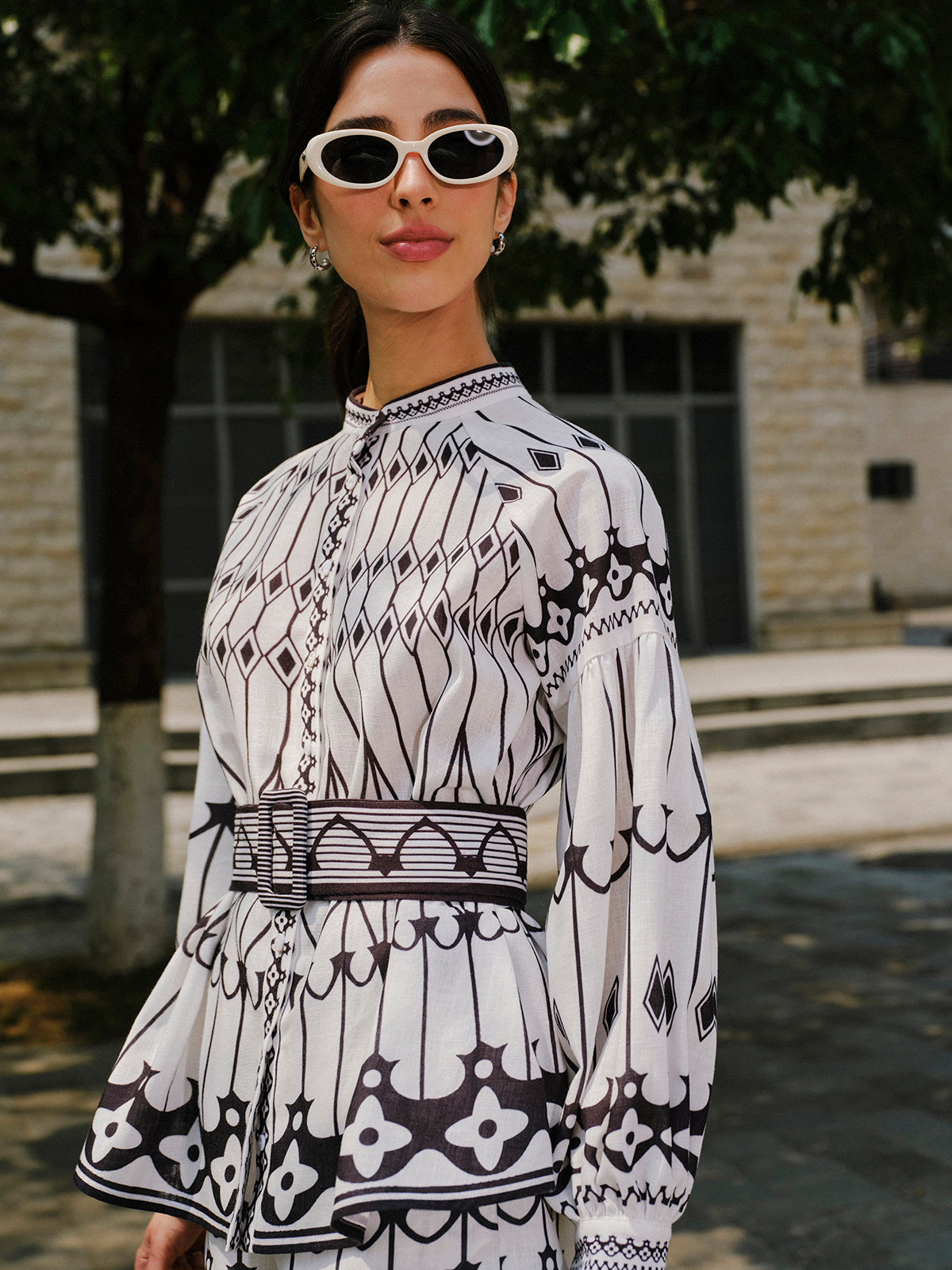Keten Karışımlı Uzun Kollu Kemerli Şort Takımı