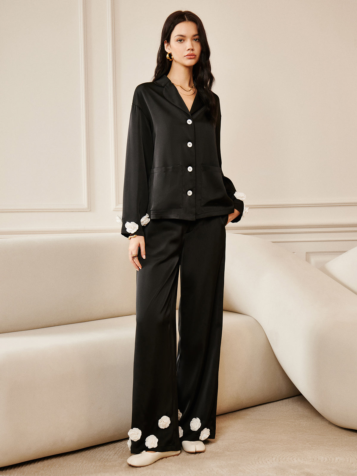 Saten 3D Çiçek Cepli Gömlek