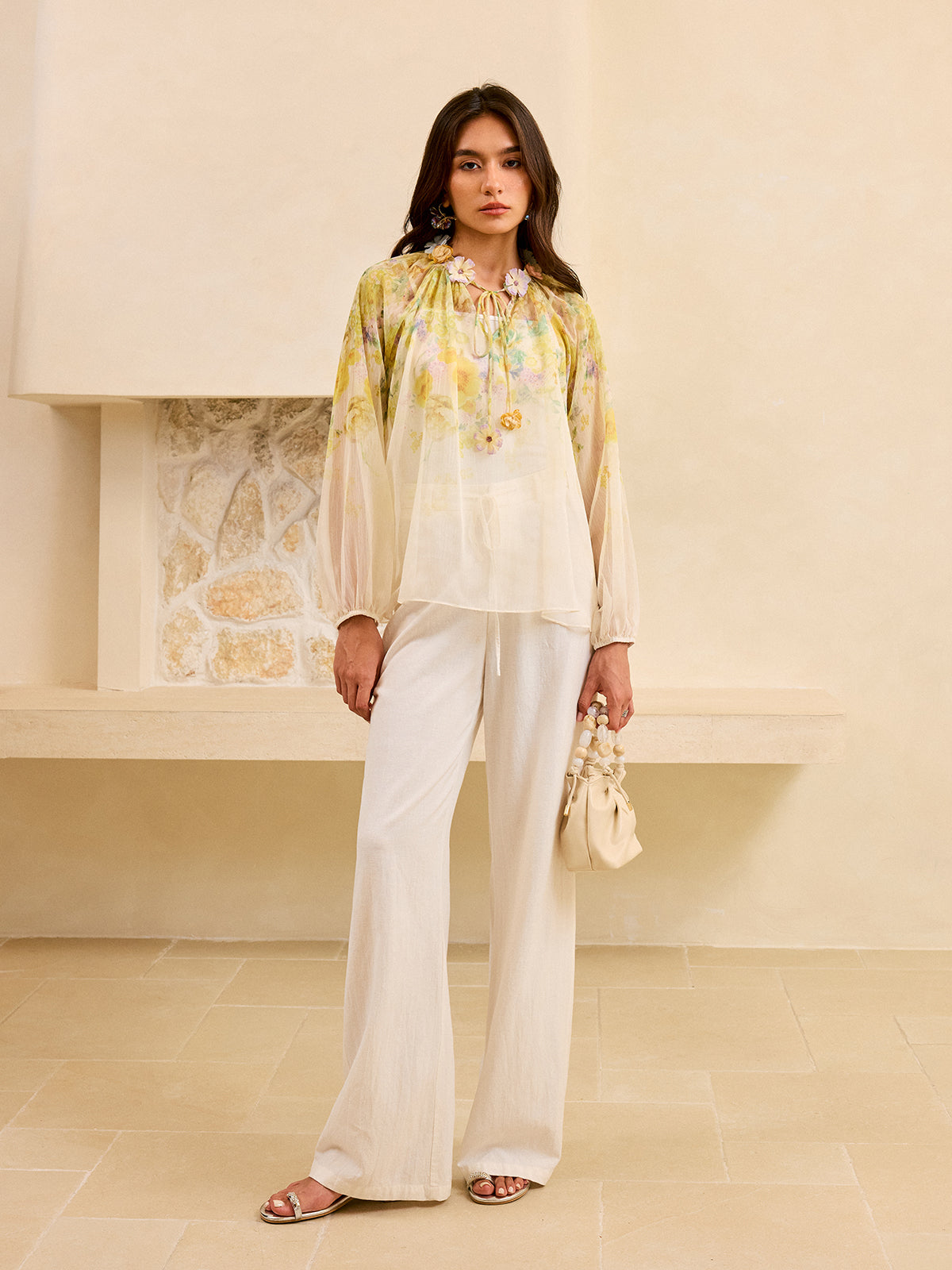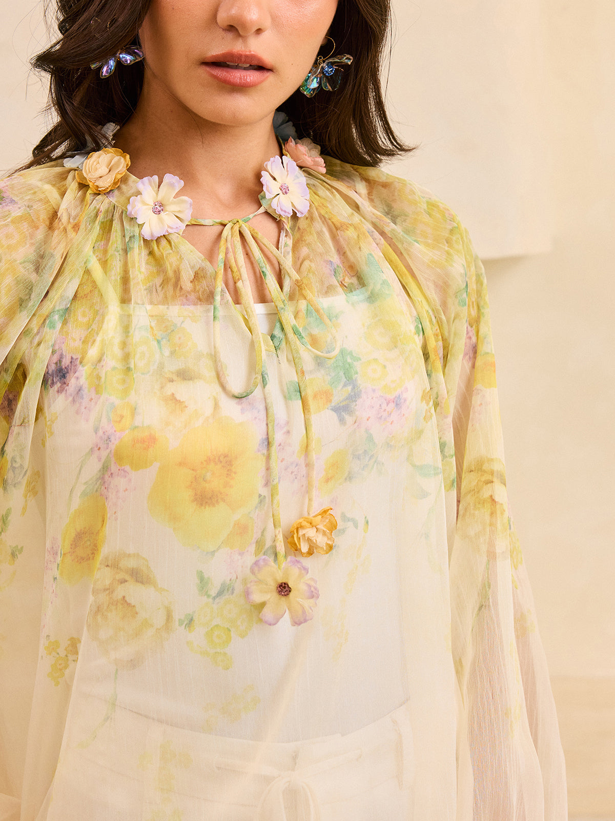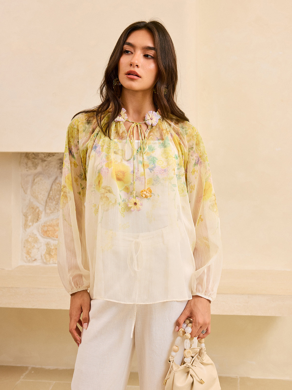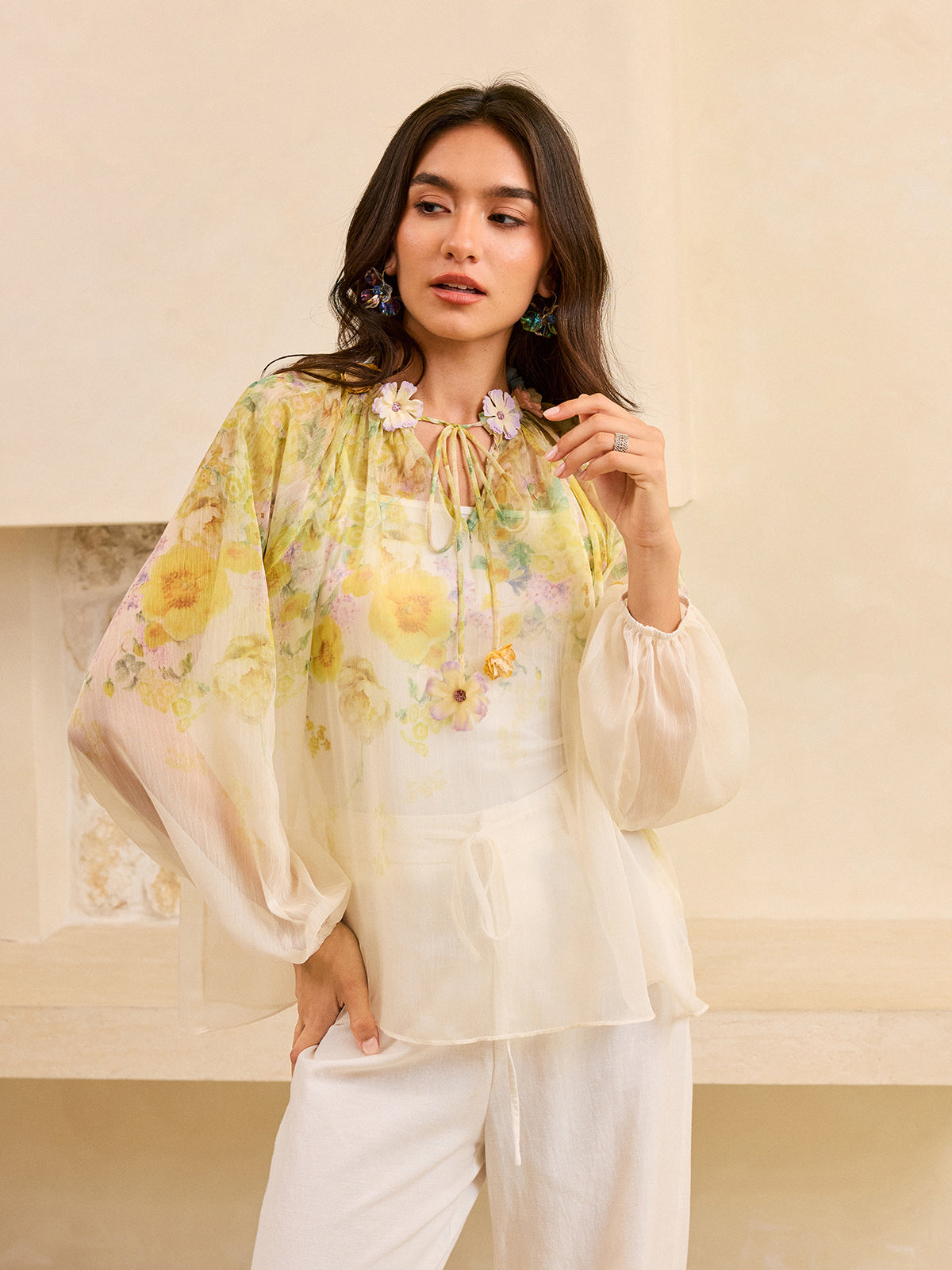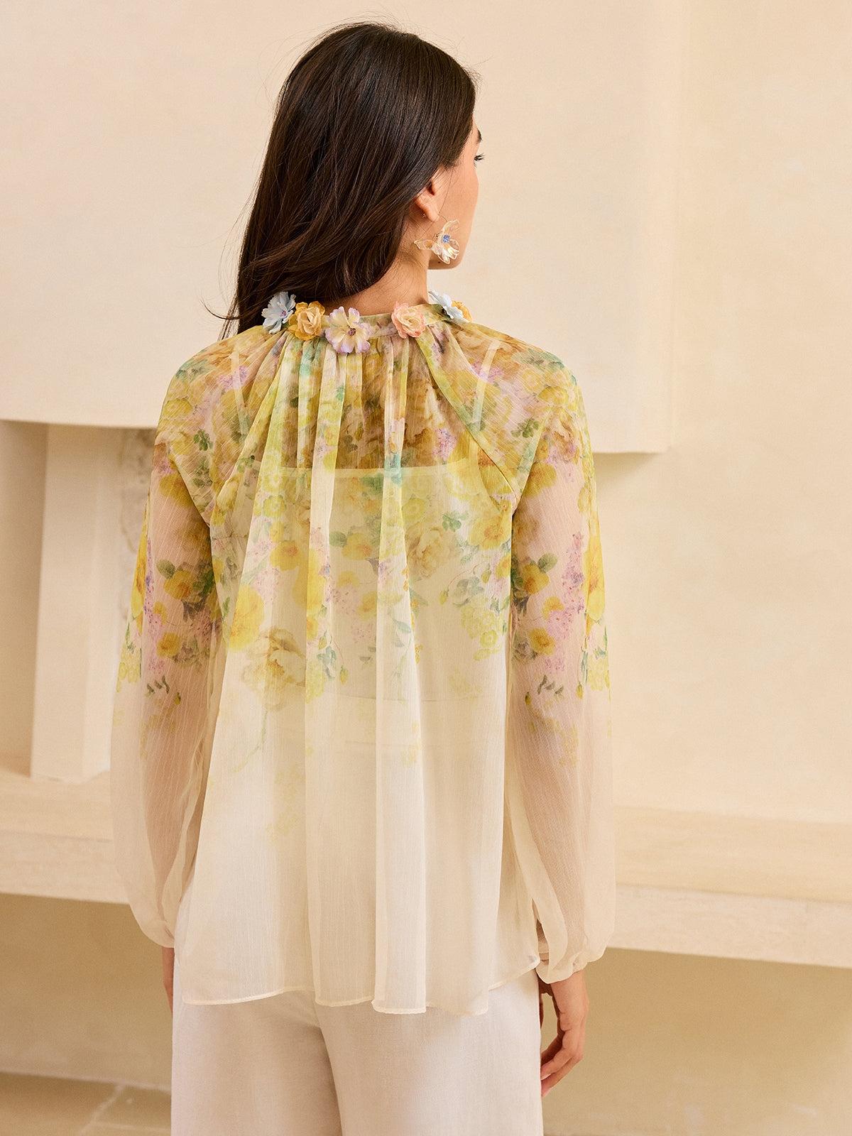 Yarı Şeffaf Çiçek Detaylı Bluz