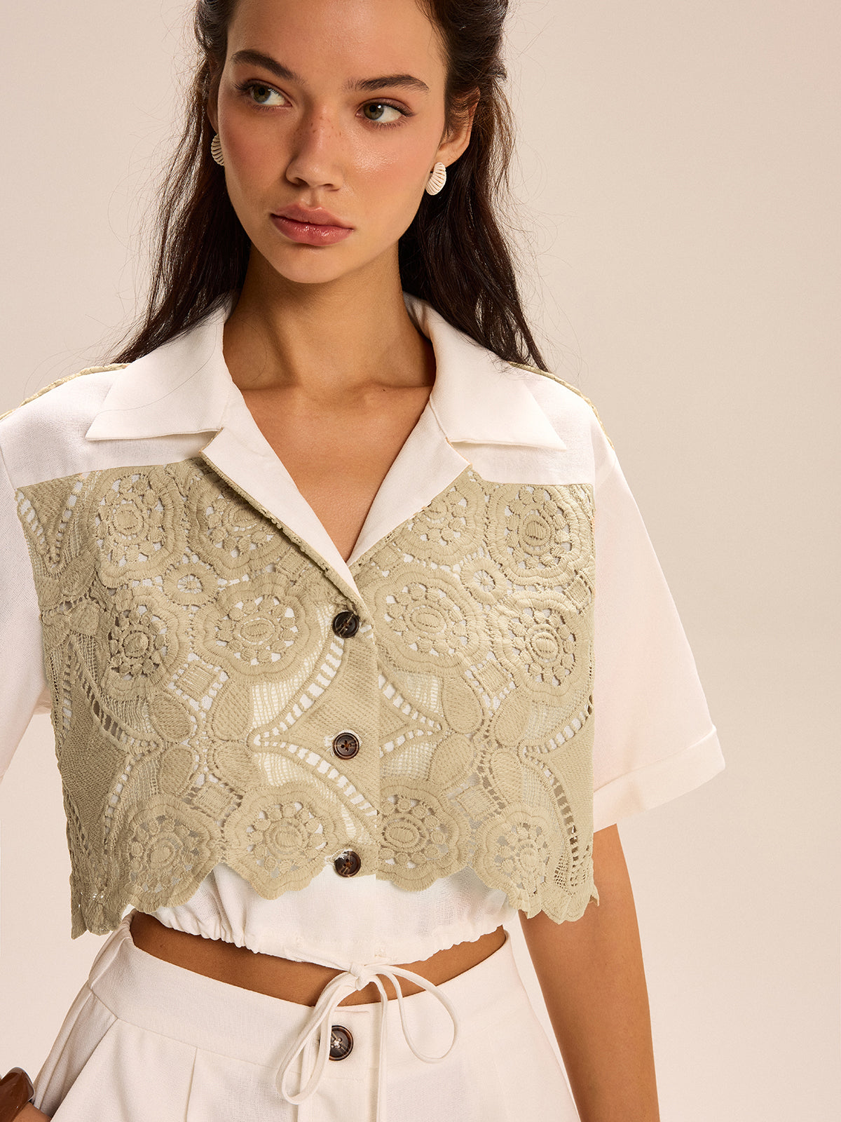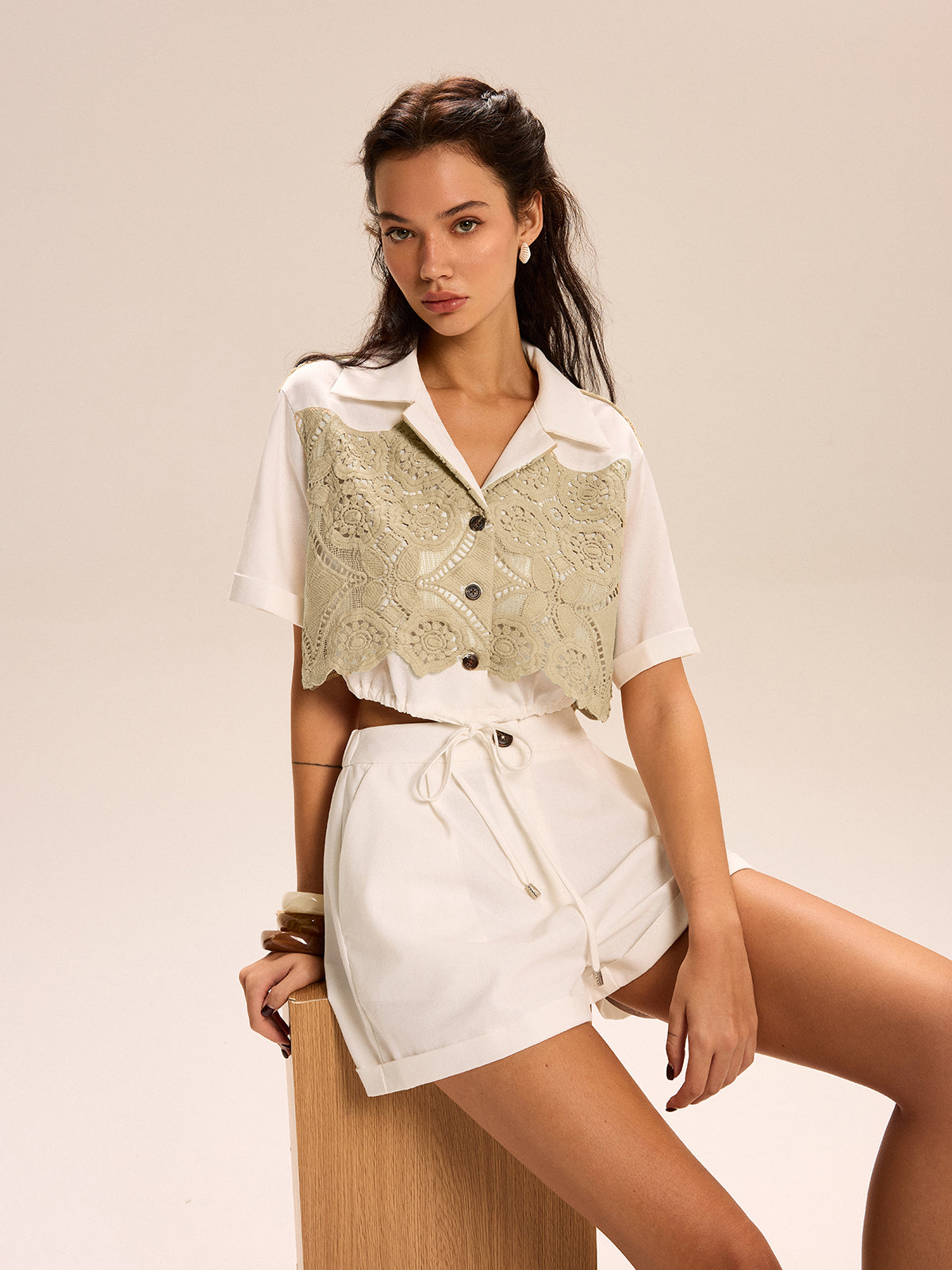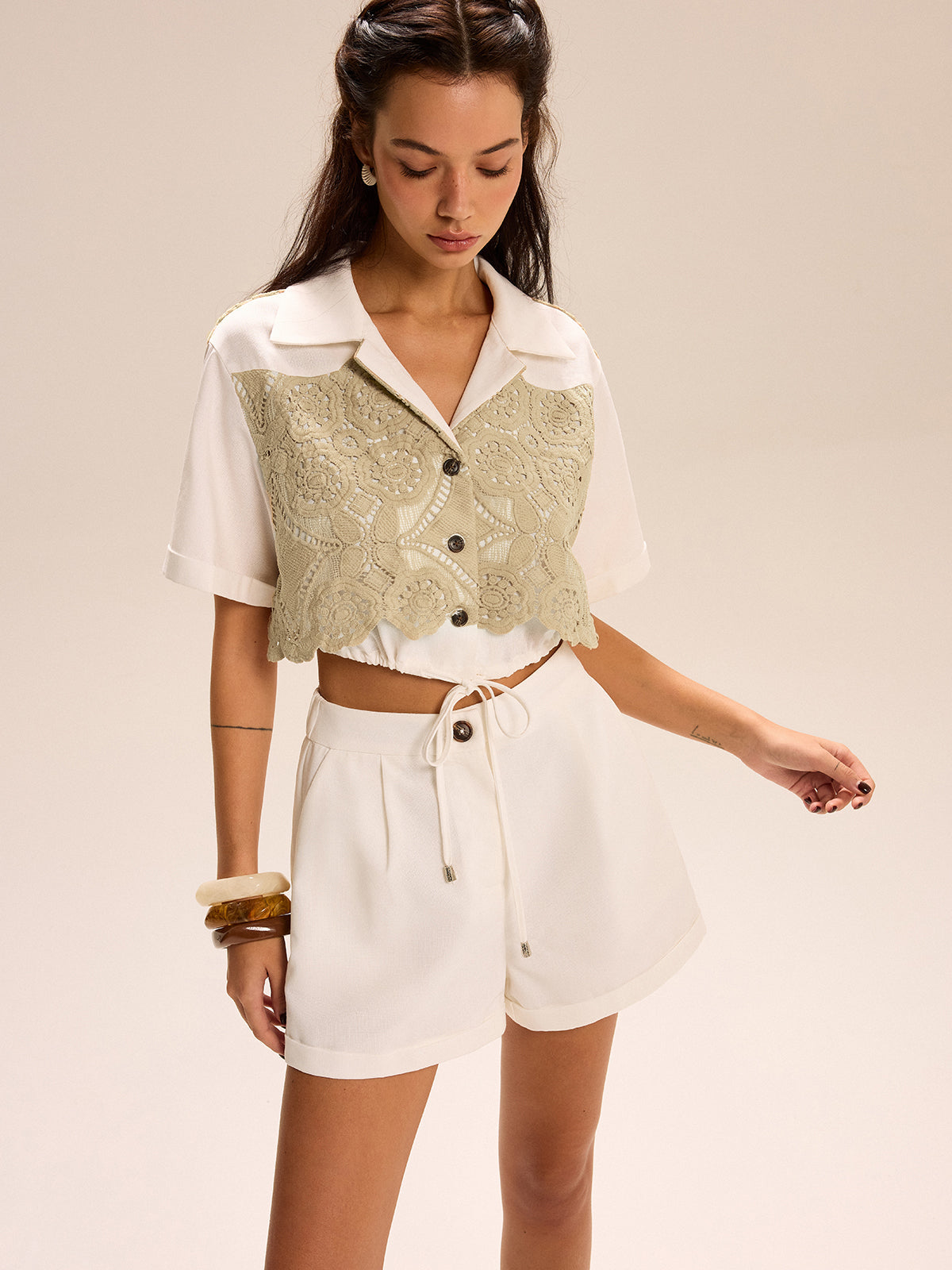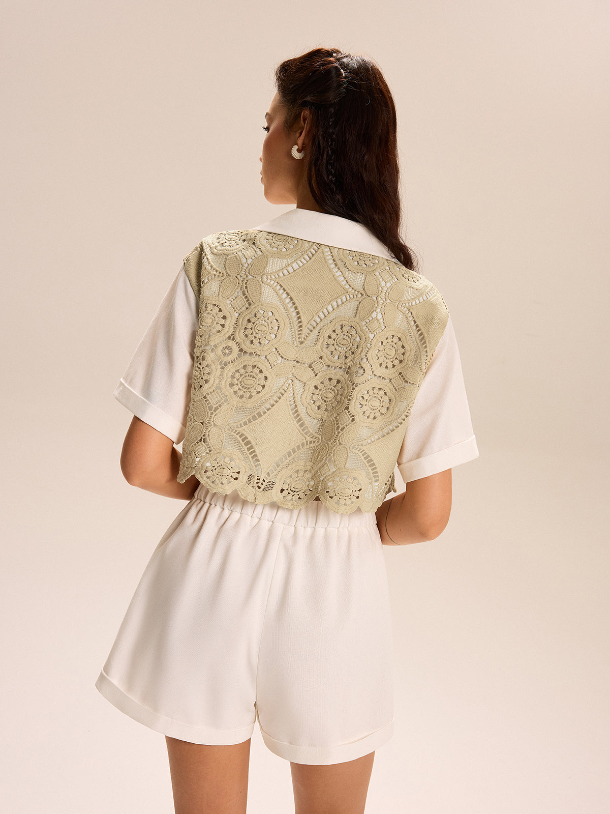 Dantel Panelli Kırpılmış Gömlek Şort Takımı
