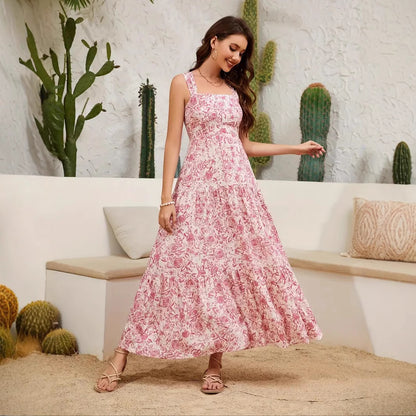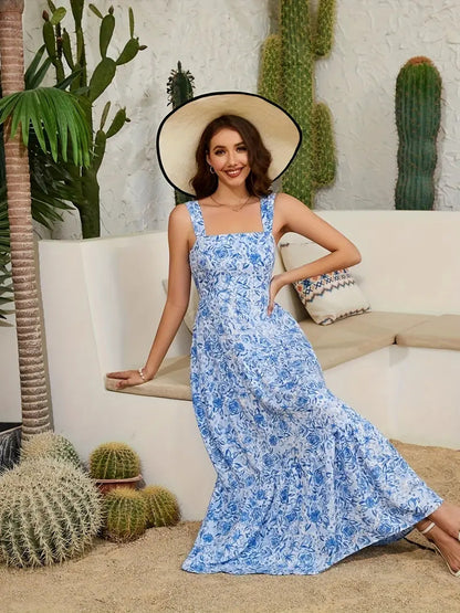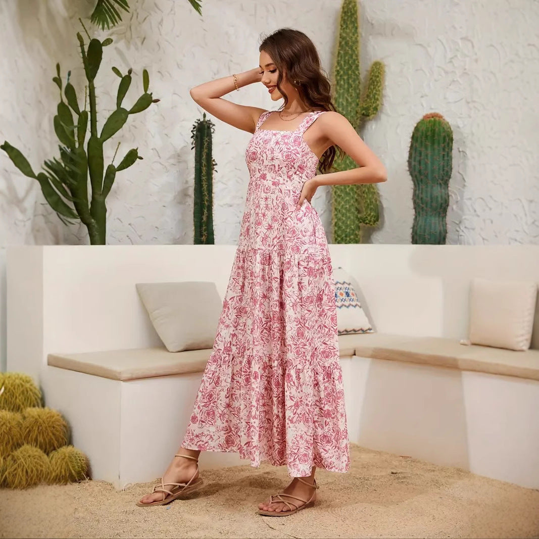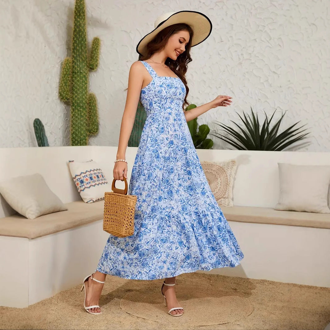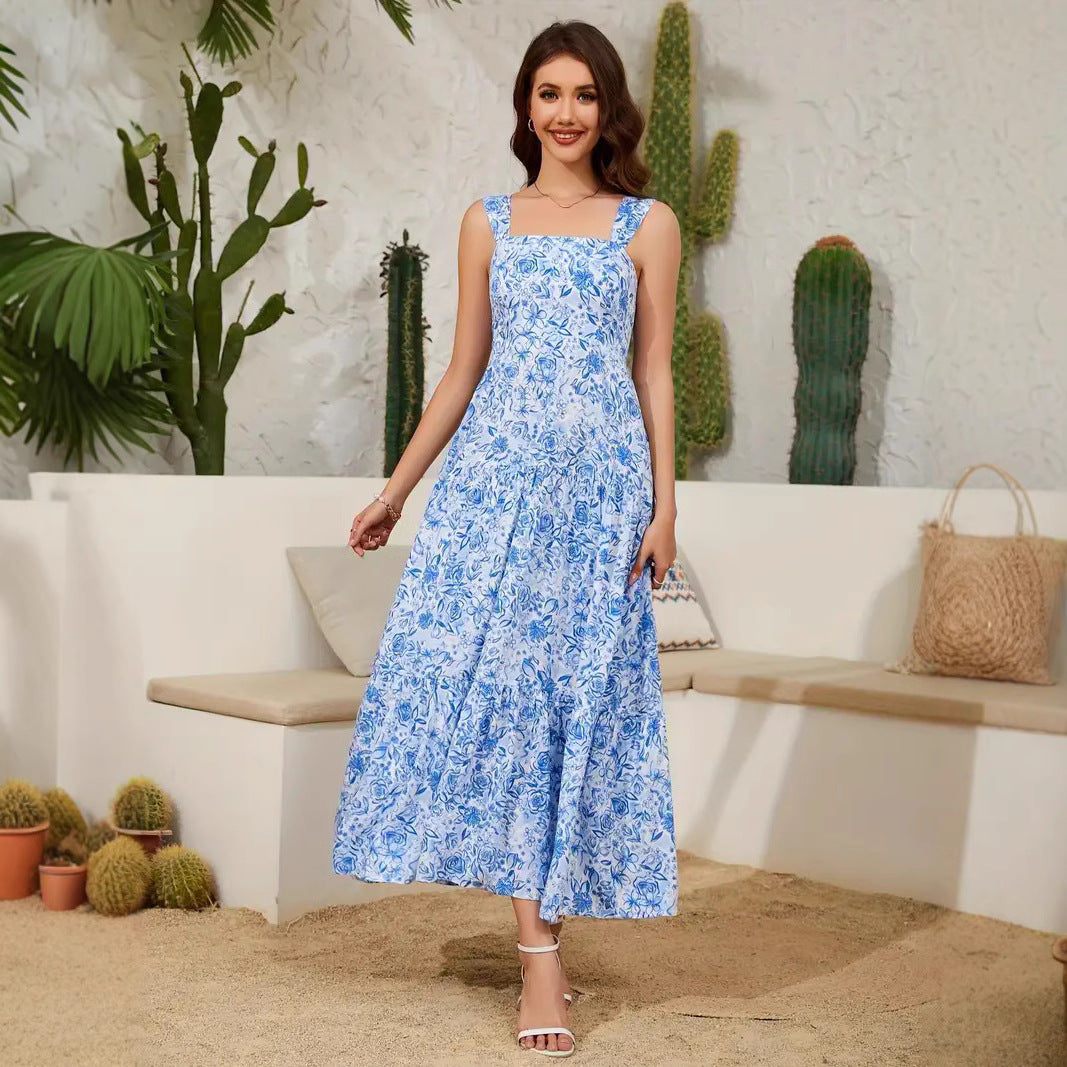 Cepli Kare Yaka Baskılı Elbise